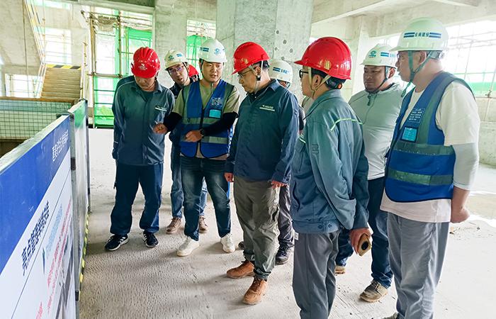 趙建兵一行深入施工現(xiàn)場(chǎng),實(shí)地查看項(xiàng)目現(xiàn)場(chǎng)安全文明施工、臨時(shí)用電設(shè)施管理、施工實(shí)體質(zhì)量及項(xiàng)目文化建設(shè)等情況,對(duì)項(xiàng)目現(xiàn)場(chǎng)標(biāo)準(zhǔn)化施工、安全質(zhì)量管控措施及重點(diǎn)部位安全防護(hù)工作成效給予充分肯定。雙方圍繞項(xiàng)目現(xiàn)場(chǎng)平面布局優(yōu)化、配變電專項(xiàng)設(shè)計(jì)施工招標(biāo)、裝飾裝修方案確定等重要事宜展開深入研討。檢查組細(xì)致查閱了相關(guān)資料,認(rèn)真聽取施工難點(diǎn)匯報(bào)及解決措施,進(jìn)一步明確了項(xiàng)目后續(xù)管理工作思路。