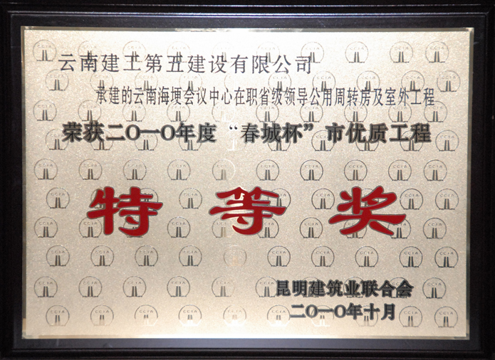 公司承建的云南海埂會議中心在職省級領(lǐng)導公用周轉(zhuǎn)房及室外工程榮獲2010年度“春城杯”市優(yōu)質(zhì)工程特等獎